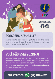 A LBV oferece atendimento psicológico gratuito e on-line para mulheres de todo o Brasil (a partir dos 12 anos). O serviço também está disponível para filhos e filhas de mulheres que vivenciaram situações de violência de gênero. a inscrição pode ser feita de qualquer parte do Brasil pelo WhatsApp: (11) 99996-6557. Após o contato, é só aguardar a primeira sessão, de acordo com a agenda dos profissionais disponíveis.