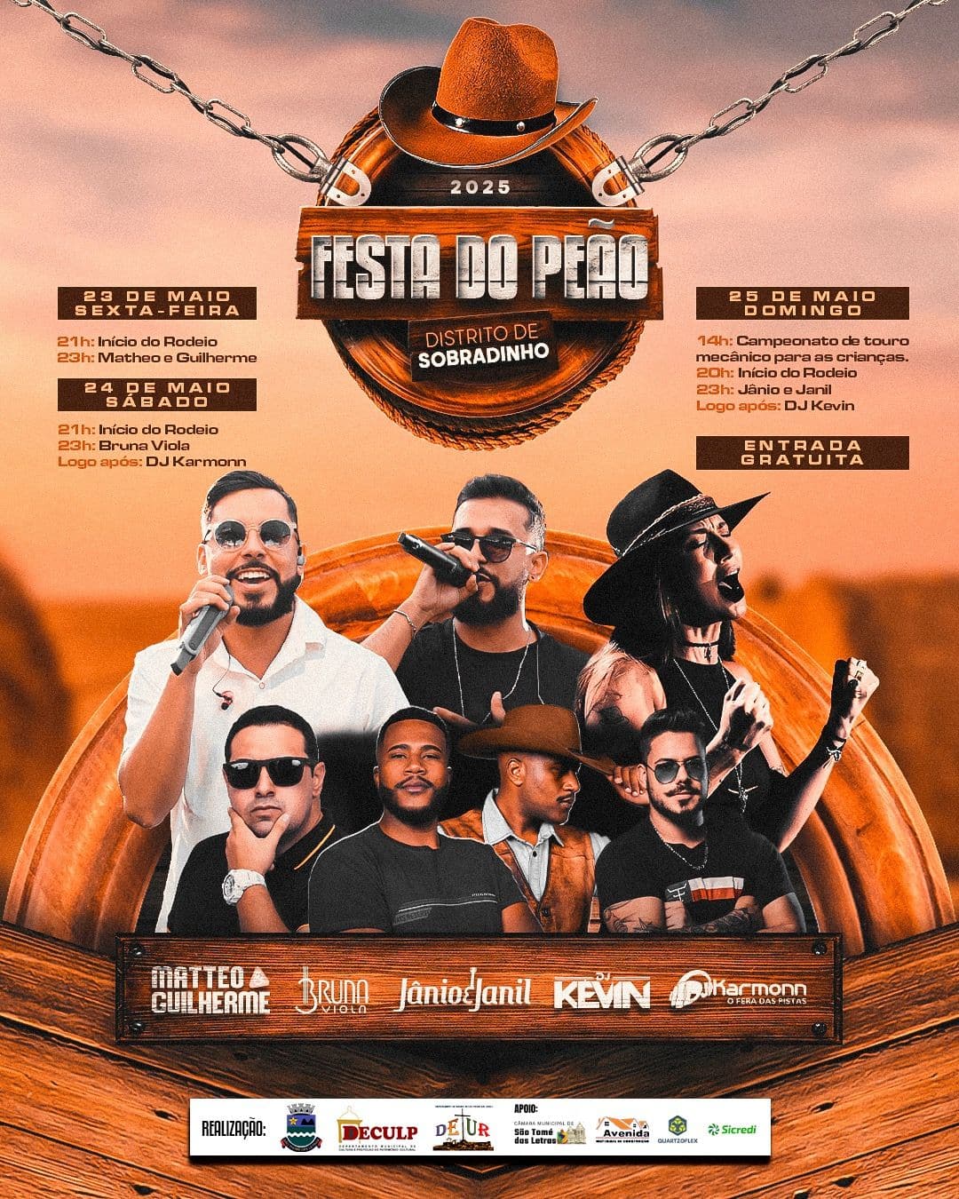 Entre os dias 23 e 25 de maio de 2025, o Distrito de Sobradinho será palco de uma das festas mais esperadas da região: a Festa do Peão 2025. Com entrada gratuita, o evento promete agitar o público com três dias de muita emoção, música e tradição sertaneja.