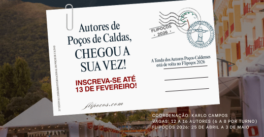 As inscrições para a Tenda de Autores Poços-Caldense na Vila Literária do Flipoços 2026 já estão abertas! Essa é uma oportunidade única de dar destaque aos nossos escritores sulfurosos, especialmente àqueles que terão superlançamentos durante o Flipoços, que acontecerá de 25 de abril a 3 de maio. Importante: este formulário é exclusivo para autores nascidos em Poços de Caldas – MG ou que residem na cidade há mais de um ano. Leia o formulário com atenção e preencha todos os campos cuidadosamente. Queremos ver o seu talento fazendo parte dessa grande celebração da literatura!