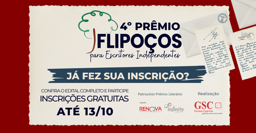 O Flipoços – Festival Literário Internacional de Poços de Caldas, em parceria com a Renovagraf, realiza a 4ª edição do Prêmio Flipoços para Autores Independentes, com o objetivo de selecionar e publicar três autores nacionais de forma independente.