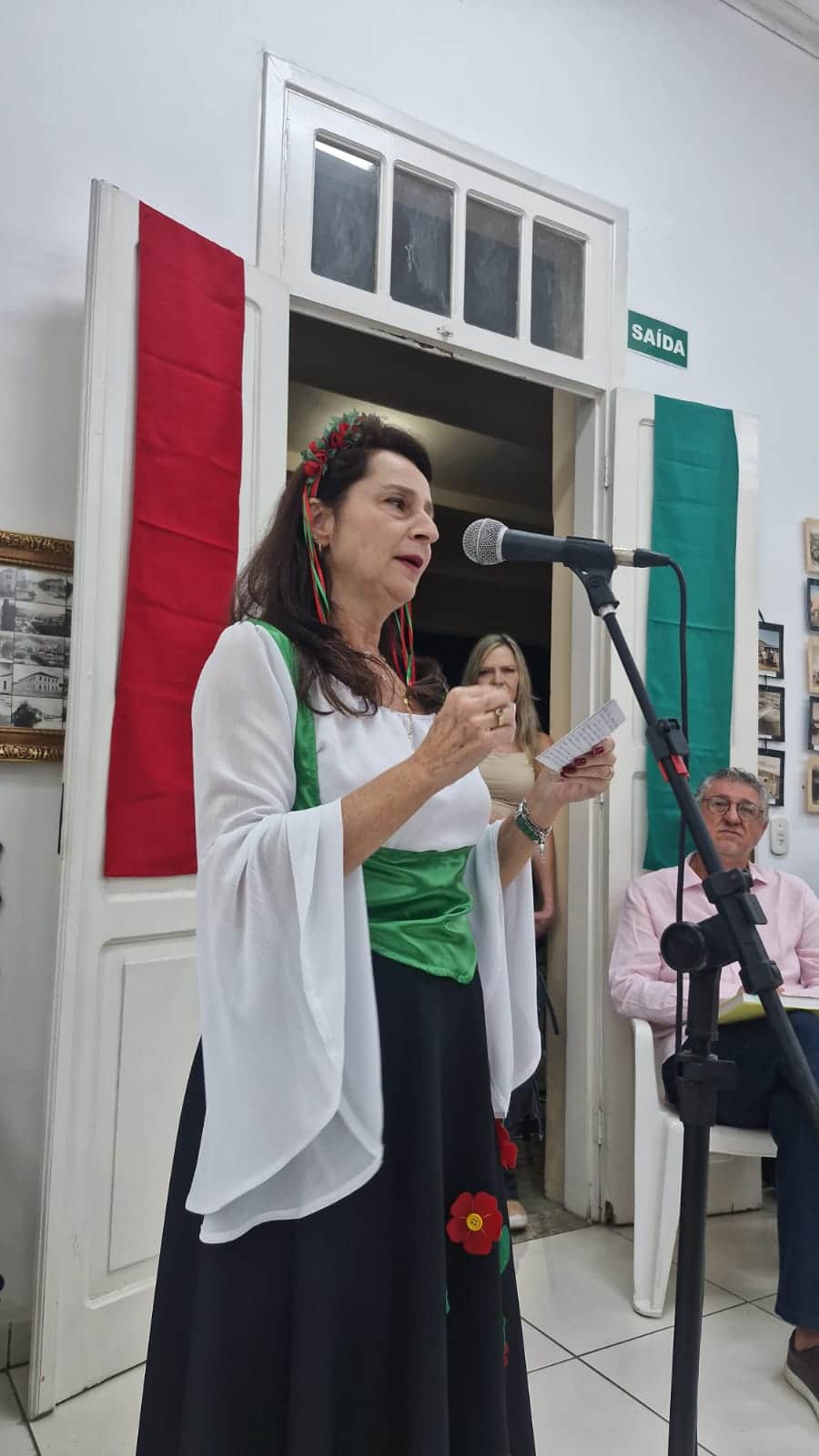 Vestida com trajes tipicamente italianos, Eliane Chiaradia emocionou a todos com a história familiar de seus parentes até os dias atuais. Depois, a diretora municipal de Turismo, Giovanna Trotta, apresentou um caminho: “O Brasil, distante e desconhecido, tornava-se promessa. E entre montanhas de Minas Gerais, surgia um novo capítulo: Itajubá”.