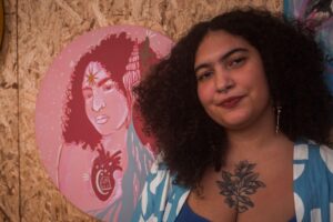A artista multidisciplinar e designer Sabres apresenta trabalhos que transitam entre pintura em diferentes suportes, pintura digital e gravura, explorando narrativas ligadas à identidade, memória e território. “A residência me permitiu maturar e canalizar de forma objetiva minha pesquisa, além de possibilitar ferramentas essenciais para a experimentação em conexão com o meu território”, explica.