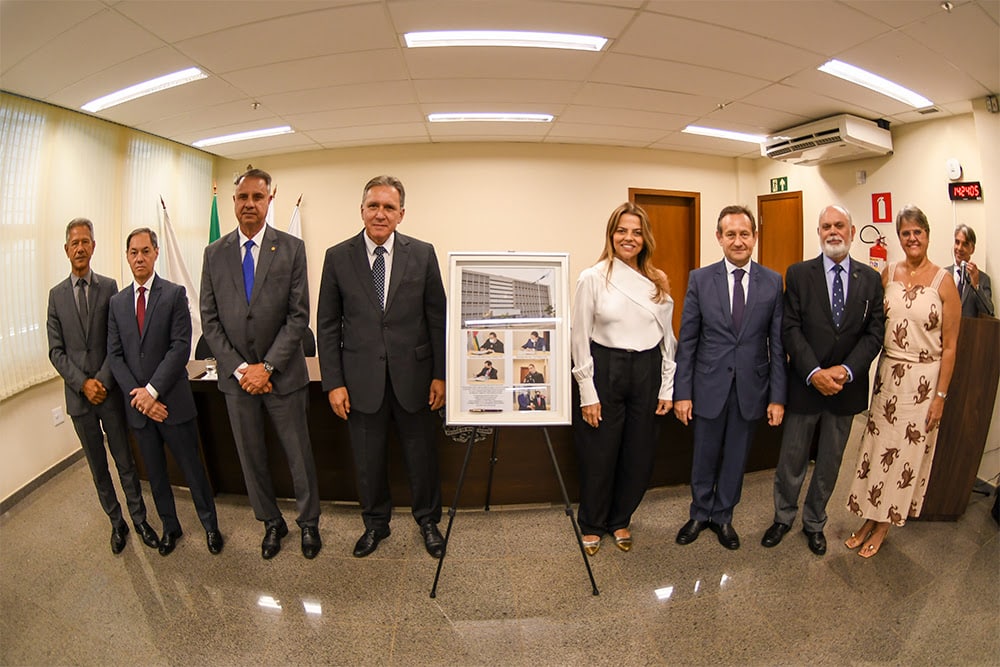 O presidente do Tribunal de Justiça de Minas Gerais, desembargador Luiz Carlos Corrêa Junior, participou, na quarta-feira (27/8), de uma solenidade comemorativa pelos cinco anos da inauguração do Fórum Tito Fulgêncio, em Araxá. O prédio foi entregue em 2020, durante a pandemia de Covid-19, em uma cerimônia simples e com número reduzido de participantes. No evento de hoje, foi descerrado um quadro com fotografias da inauguração e junto da caneta Montblanc utilizada para a assinatura do ato, que foi doada pelo então desembargador Afrânio Vilela, hoje ministro do Superior Tribunal de Justiça (STJ), e passou a integrar o acervo da Comarca.