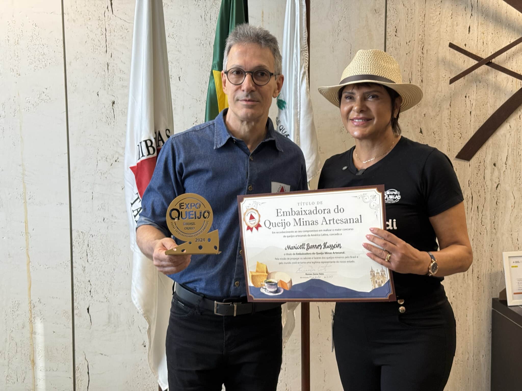 O Governo de Minas Gerais entregou, na manhã desta segunda-feira (9), o título de Embaixadora do Queijo Minas Artesanal (QMA) à organizadora da ExpoQueijo Brasil e produtora cultural Maricell Hussein. A homenagem foi feita pelo governador Romeu Zema em reconhecimento ao trabalho que ela desenvolve há anos na defesa do queijo artesanal mineiro e na articulação de políticas públicas e estratégias de valorização do setor. “Maricell tem sido a pessoa que mais tem contribuído na valorização e divulgação do nosso queijo, que é a marca mais famosa de Minas Gerais. Temos que agradecer e valorizar todo este trabalho, por isso o reconhecimento é mais do que merecido”, destacou o governador.