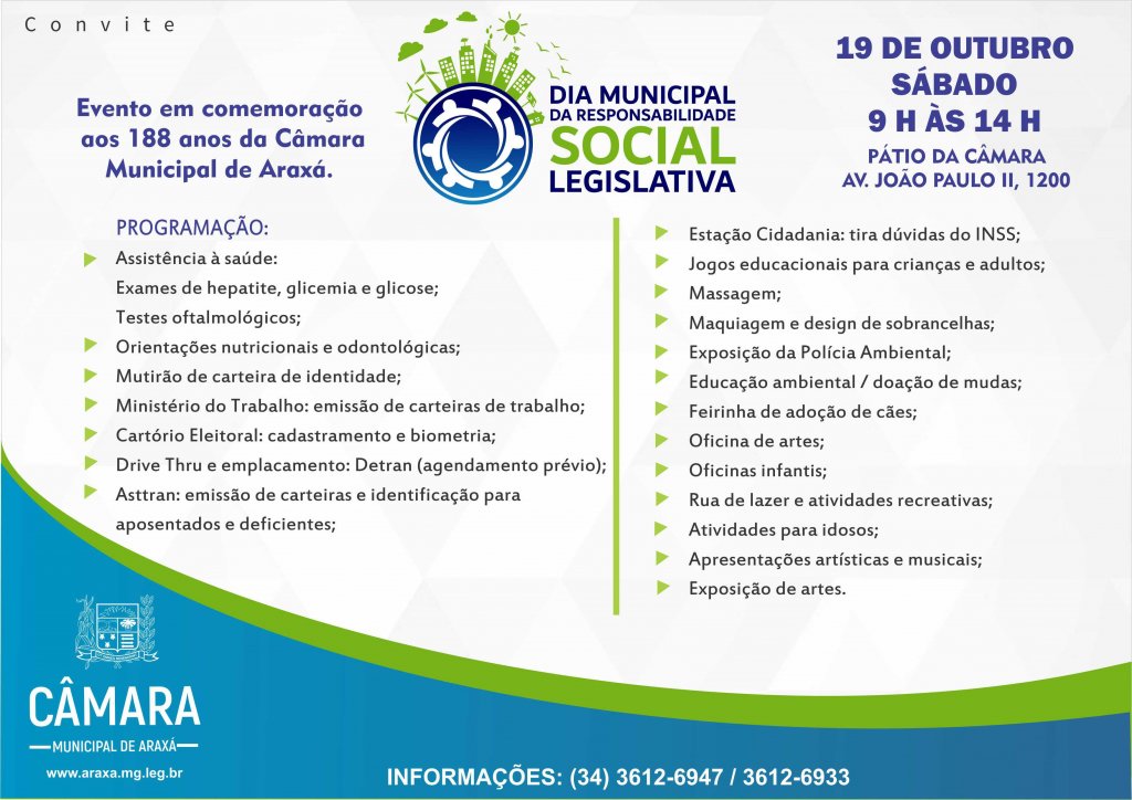 Vem aí o Dia Municipal da Responsabilidade Social Legislativa. Neste sábado (19/12), das 9 às 14h, diversas atividades serão realizadas no pátio da Câmara Municipal de Araxá: Emissão de Documentos, Exames na Área de Saúde, Orientação Jurídica, Atrações Artísticas, Rua de Lazer, entre outras.