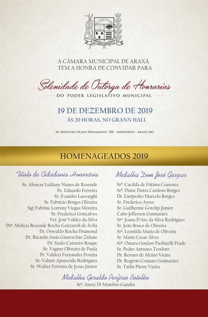 No dia 19 de dezembro, às 20 h, no Grann Hall, será realizada Reunião Solene da Câmara Municipal de Araxá para entrega do Título de Cidadania Honorária e outorga das Medalhas: Dom José Gaspar e Geraldo Porfírio Botelho. O evento é realizado em comemoração aos 154 anos de emancipação política de Araxá.