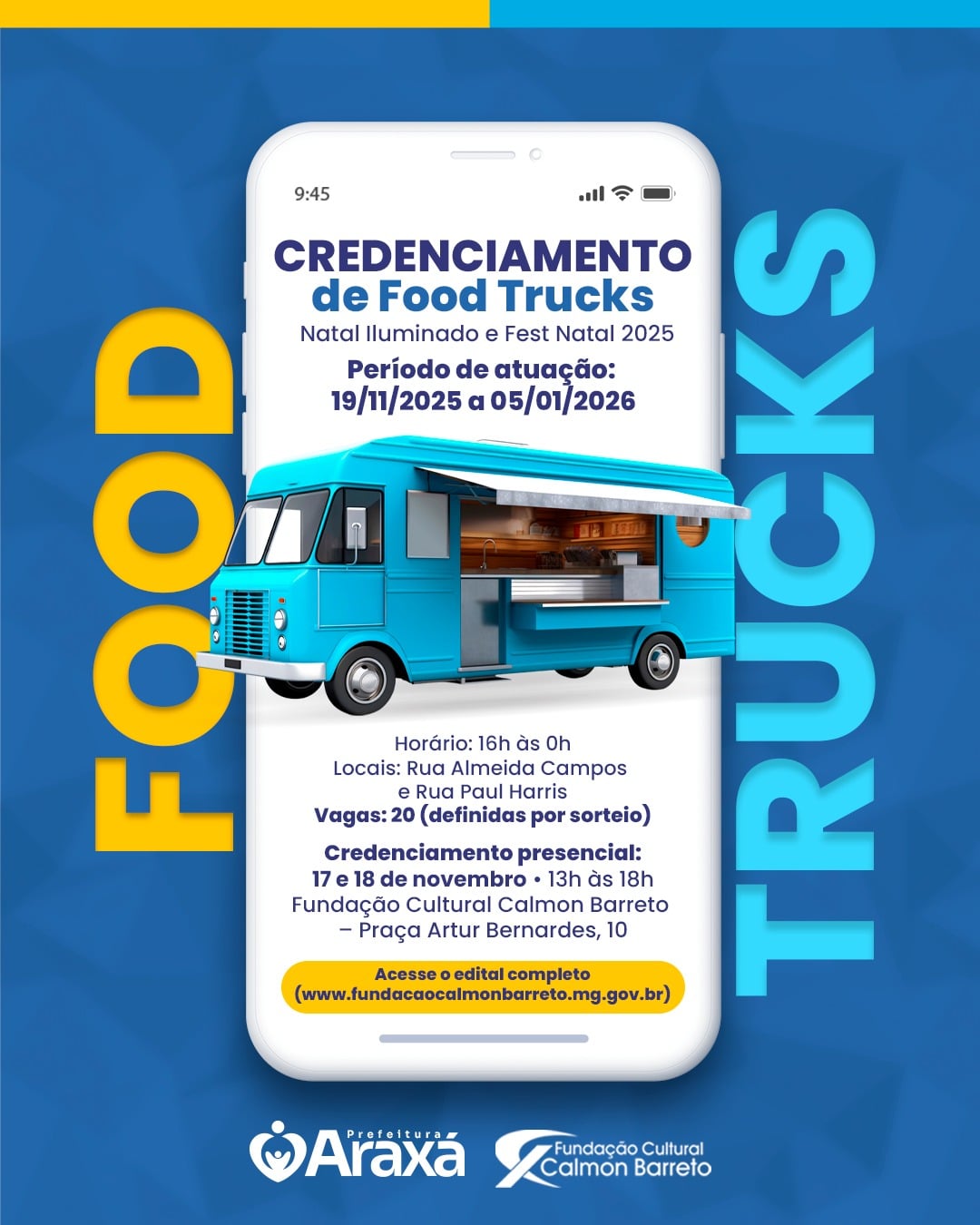 O funcionamento dos Food Trucks durante o evento está autorizado diariamente das 16h à meia-noite. Durante o período do Natal Iluminado, os credenciados estarão isentos da cobrança de Zona Azul. As vagas serão preenchidas prioritariamente por empreendedores de Araxá, e Food Trucks de outros municípios só poderão participar caso haja vagas remanescentes.