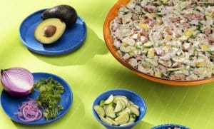 Abra as latas de atum, retire o líquido e coloque em um recipiente médio e adicione a cebola roxa, o avocado, o suco do limão, o iogurte e o cream cheese.