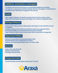 A Prefeitura de Araxá informa que as repartições públicas municipais, secretarias e autarquias estarão fechadas de 15 a 17 de agosto. O atendimento ao público será retomado na segunda-feira, dia 18.