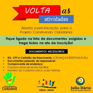 Estão abertas as pré-inscrições para o Projeto Construindo Cidadania, realizado pelo Centro de Formação Profissional Julio Dário por meio do Conselho Municipal dos Direitos da Criança e do Adolescente de Araxá (CMDCA), destinado a crianças e adolescentes de 06 a 14 anos. O Projeto atende no contraturno escolar, com atividades socioeducativas, como oficinas artísticas, musicais, rítmicas, acompanhamentos pedagógico e psicossocial.