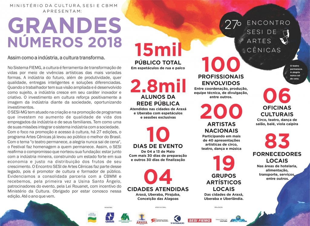 O 27º Encontro SESI de Artes Cênicas teve excelentes resultados alcançados. Tudo isso foi possível graças a união de esforços dos organizadores, cada meio de comunicação, o trabalho de cada colaborador, a eficácia dos artistas, todos celebrando as variadas formas da cultura em quatro municípios. Tudo isso só poderia resultar em um sucesso absoluto com resultados altamente positivos.
