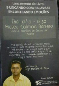 O Belíssimo Museu Calmon Barreto de Araxá, na rua Franklin de Castro 160, foi o local escolhido para o escritor Jorge Matildes Silva lançar seu segundo livro “Brincando com palavras e encontrando emoções”. Um trabalho que também fala sobre poesias que falam de saudade, encontros, amores, ilusões e desilusões escritas através de inspirações espontâneas e instantâneas. Versos que falam com o coração e evocam sentimentos escondidos no fundo da alma. …”na estrada da vida encontrei muita amargura, mas encontrei muitas flores que me enchem de ternura, com sua delicadeza e o seu perfume que, no ar, serpenteia, faz o coração estremecer e o sangue ferver nas veias” . O lançamento será no dia 17 de outubro de 2017, as 18.30h e conta com o apoio cultural da Fundação Calmon Barreto de Araxá.