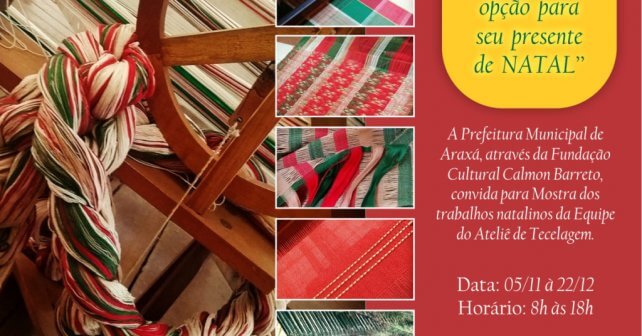 A Prefeitura Municipal de Araxá, através da Fundação Cultural Calmon Barreto convida a população e visitantes a conhecerem de perto a Mostra dos trabalhos natalinos da equipe do atelier de artes. Vale a pena conferir e adquirir trabalhos confeccionados com qualidade, criatividade e conhecimento.