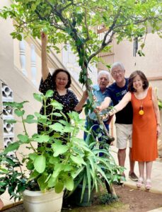 Membros da confraria em torno de um legítimo pé que produz o misterioso “Chá das folhas de lima-da-pérsia”.